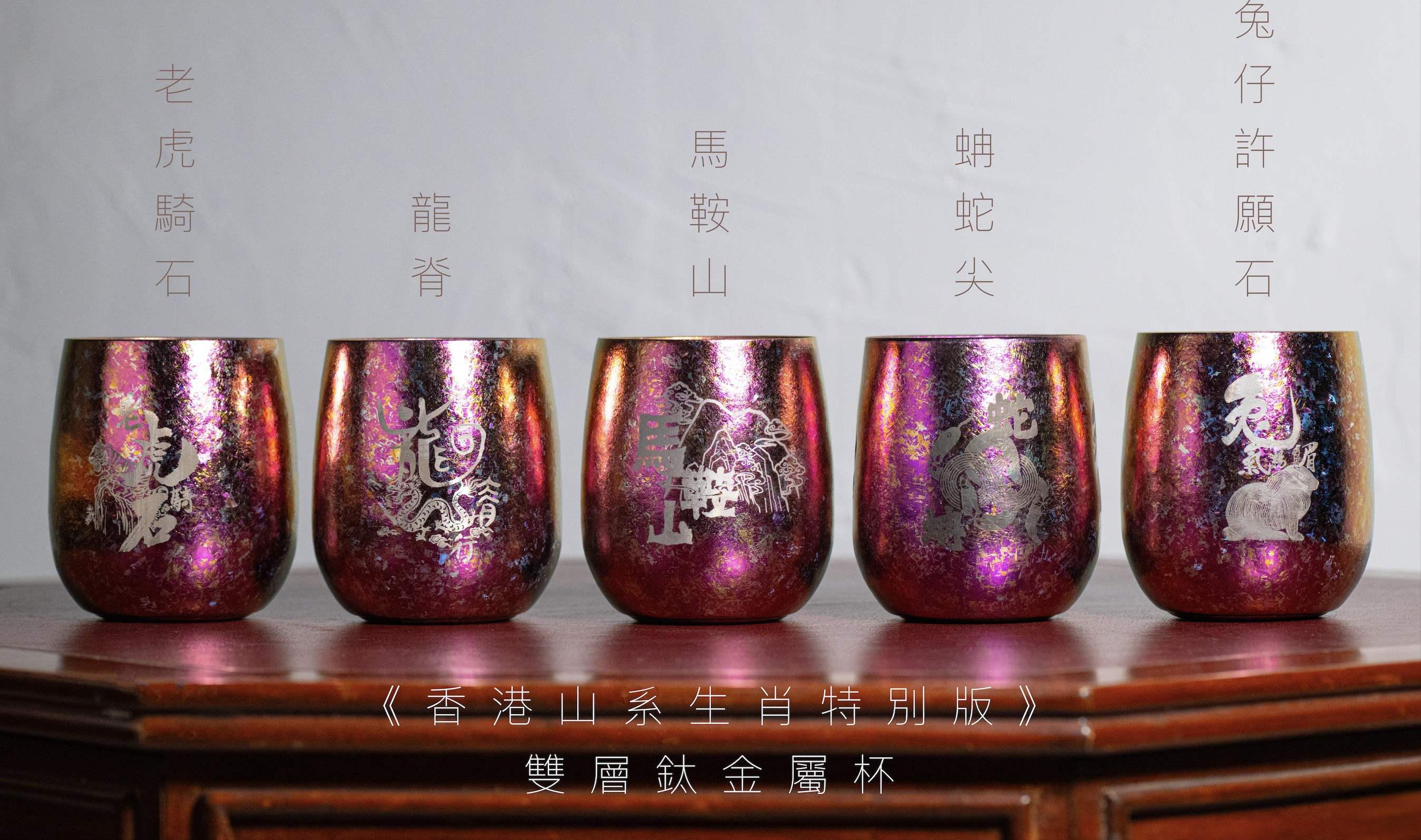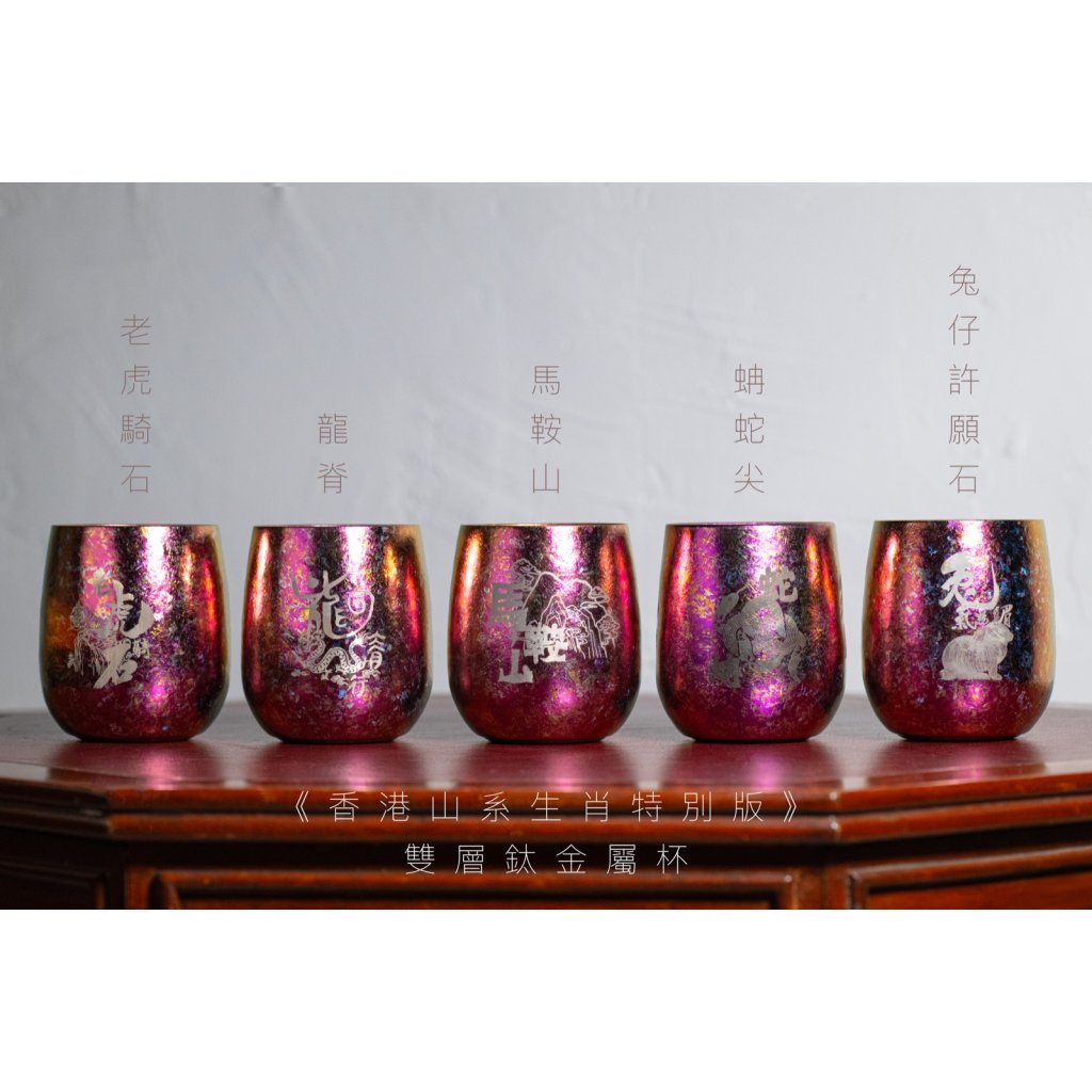 自2021 年,我們每年新年都推出一款屬於該年生肖的山系鈦金屬杯,並從香港的山峰獲取靈感,盼望能為大家設計一套十二款生肖雙層鈦金屬杯。每年的設計都會帶出不同藝術元素,為大家帶來多多驚喜,等待大家發掘!
