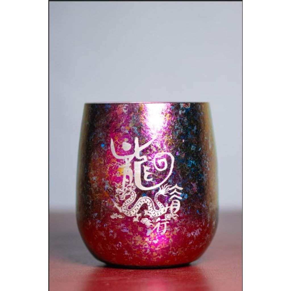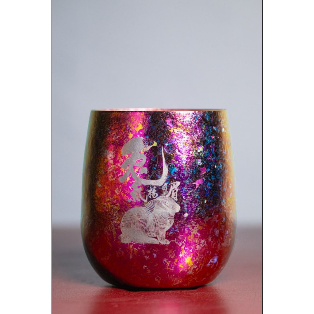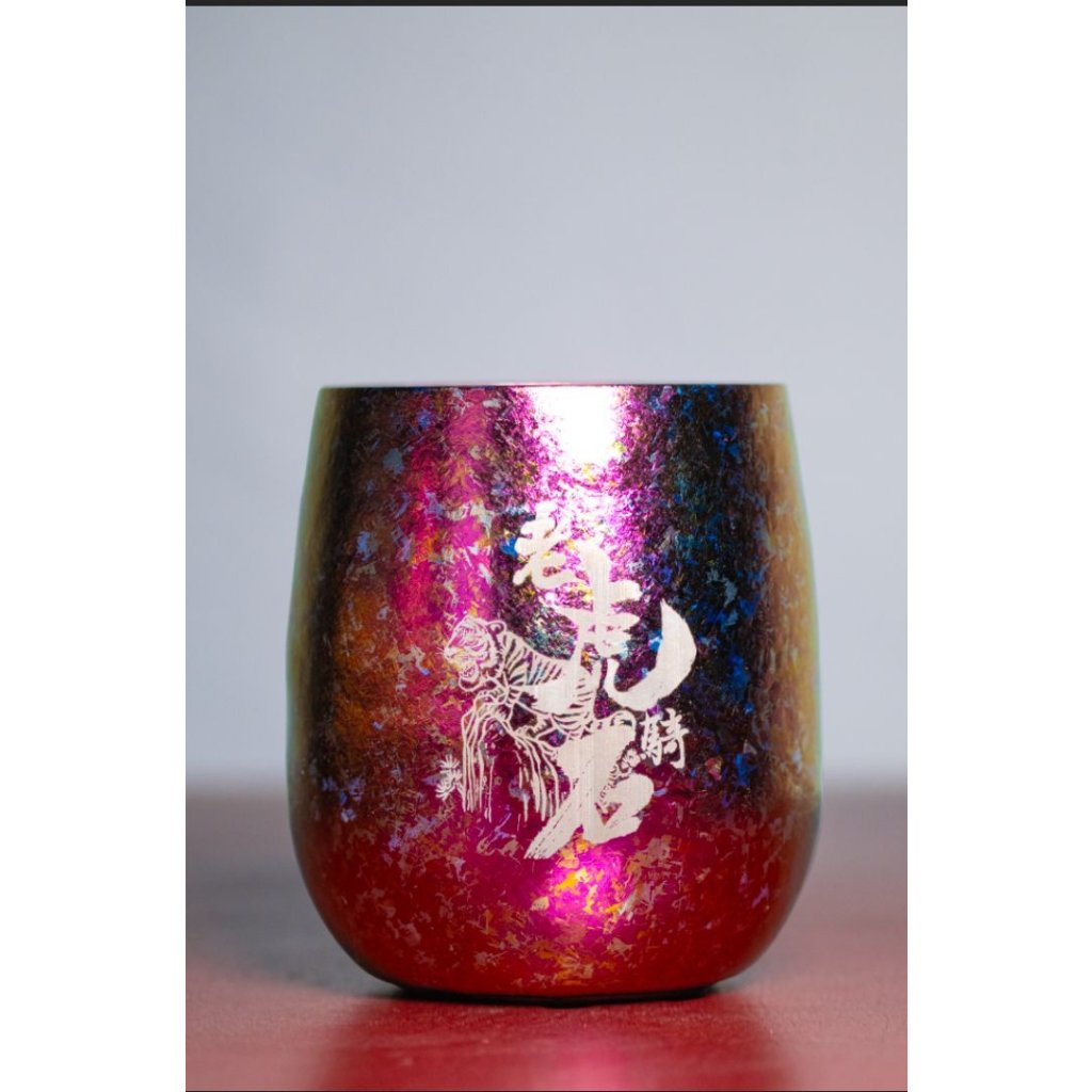 杯身採用帶出新春之喜的顏色設計:杯身為紫紅色,杯中金黃色——取其紫氣金來的意思。而顏色並非電鍍而成,而是以超過200度高溫加熱的製作方法讓鈦金屬改變顏色,作品獨一無二。雙層結構設計除了保溫、保冷外,更不會燙手。不論是收藏還是使用,嚐熱茶或品酒都是十分合適!
